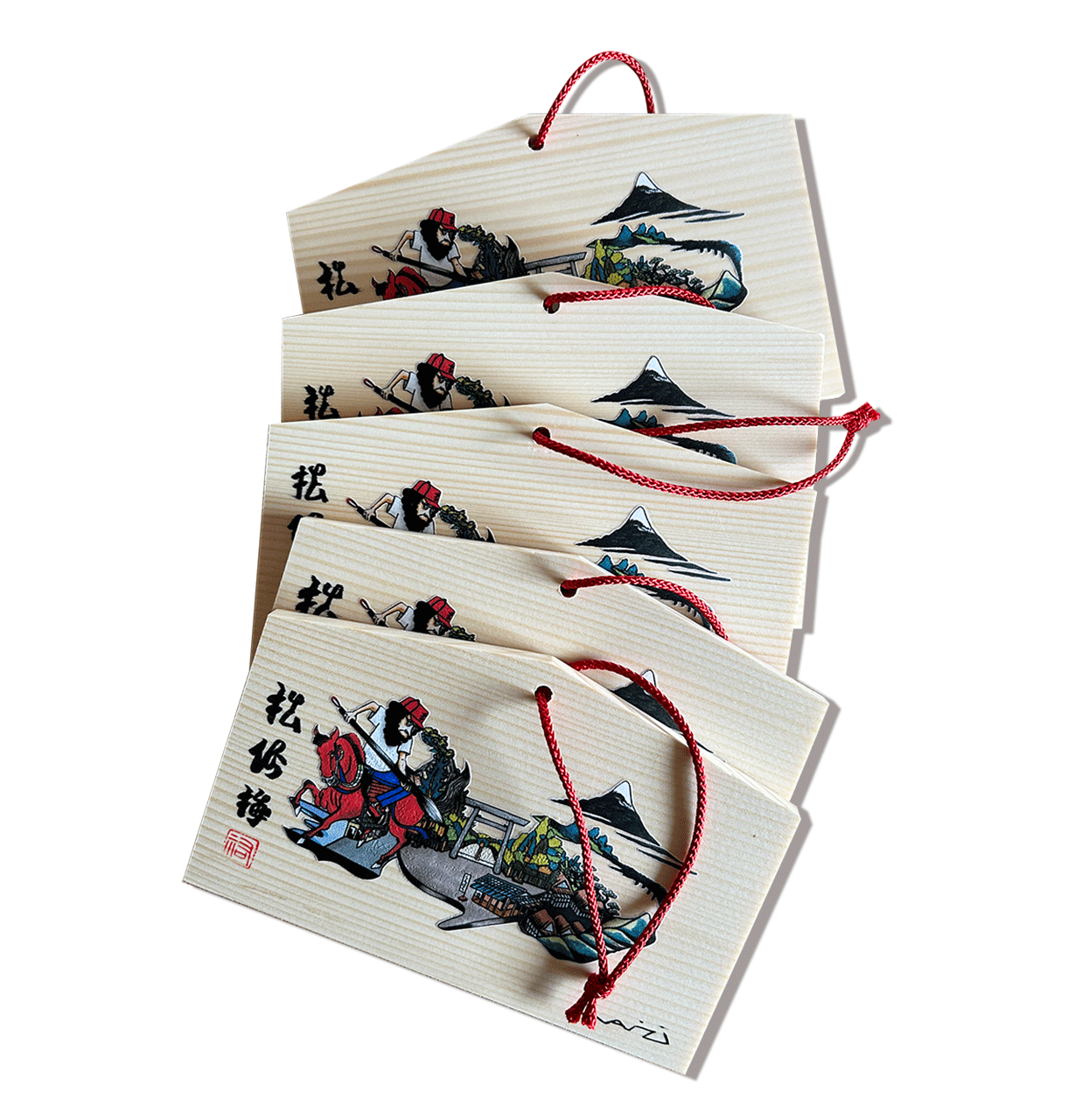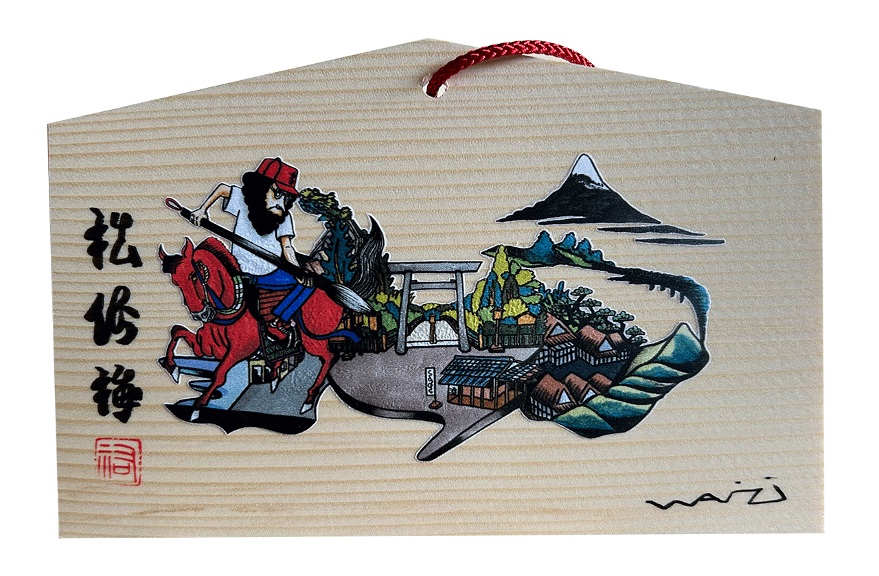 WAIZIが描いたイラストをアイロンプリントした絵馬になります。